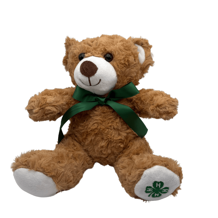 Meet your new cuddle companion! This adorable teddy bear proudly displays the iconic 4-H Clover, making it the perfect plush pal for members and supporters alike. Dressed in a charming green ribbon bow tie that matches the spirit of 4-H, this soft friend is ready for hugs, adventures, and memories. Whether it's a gift to celebrate achievement or a keepsake to cherish the 4-H experience, this bear brings warmth and joy to any collection.